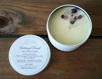 Archangel Raziel is often described as the keeper of secrets and the angel of mysteries. His energy is said to bring spiritual insight, aiding one in uncovering divine truths. At Dragonfly Naturals, I've curated a special candle infused with Lavender and Amethyst chips to embody this unique angelic essence. This candle aims to bridge the earthly and the ethereal, creating a sense of clarity in your spiritual journey. With its soothing qualities, this candle becomes an ideal companion for meditation or when engaging in reflective practices.
