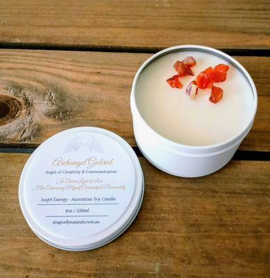 Archangel Gabriel Candle infused with Bergamot & Orange, featuring Carnelian Chips. This piece is not just a candle; it is a beacon for creativity and clear communication.