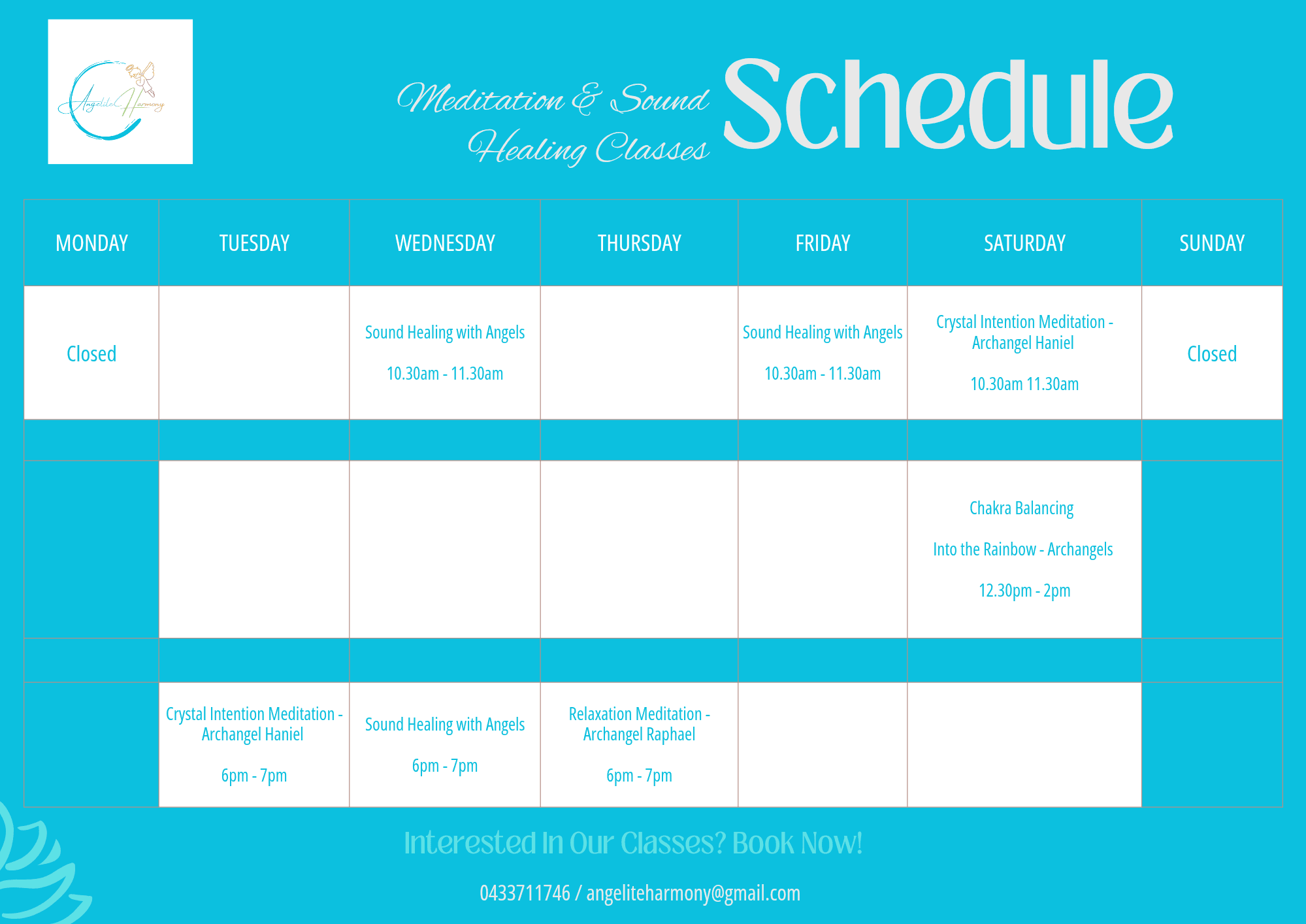 To book please contact Jeanette via email - angeliteharmony@gmail.com or text/phone on 0433711746